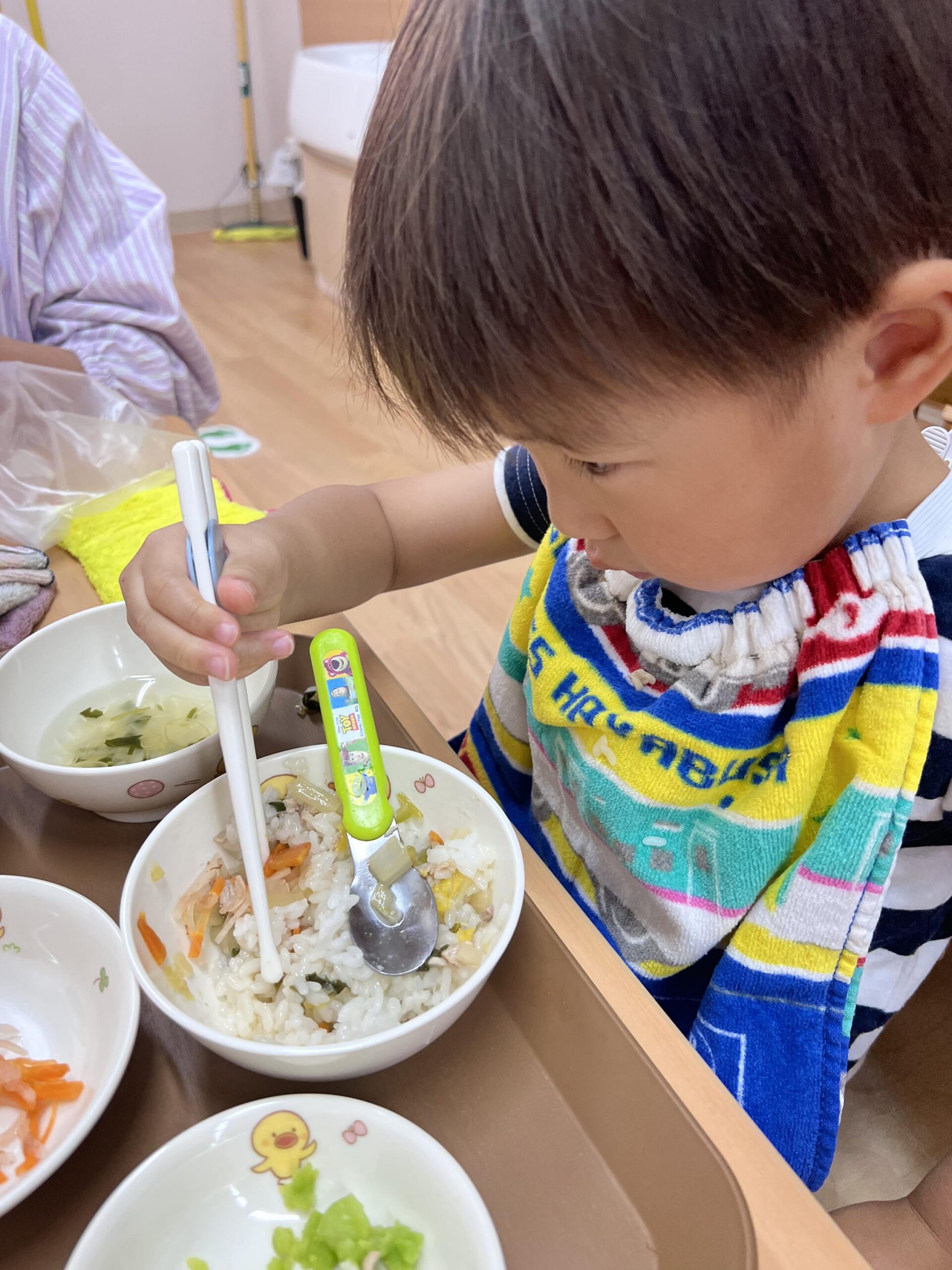 2歳児クラスのお友達は、自分たちでスプーンやフォークを持って食べる事がずいぶんと上手になったので、昨日からお箸を持って食べる練習をし始めました(*^-^*)♡