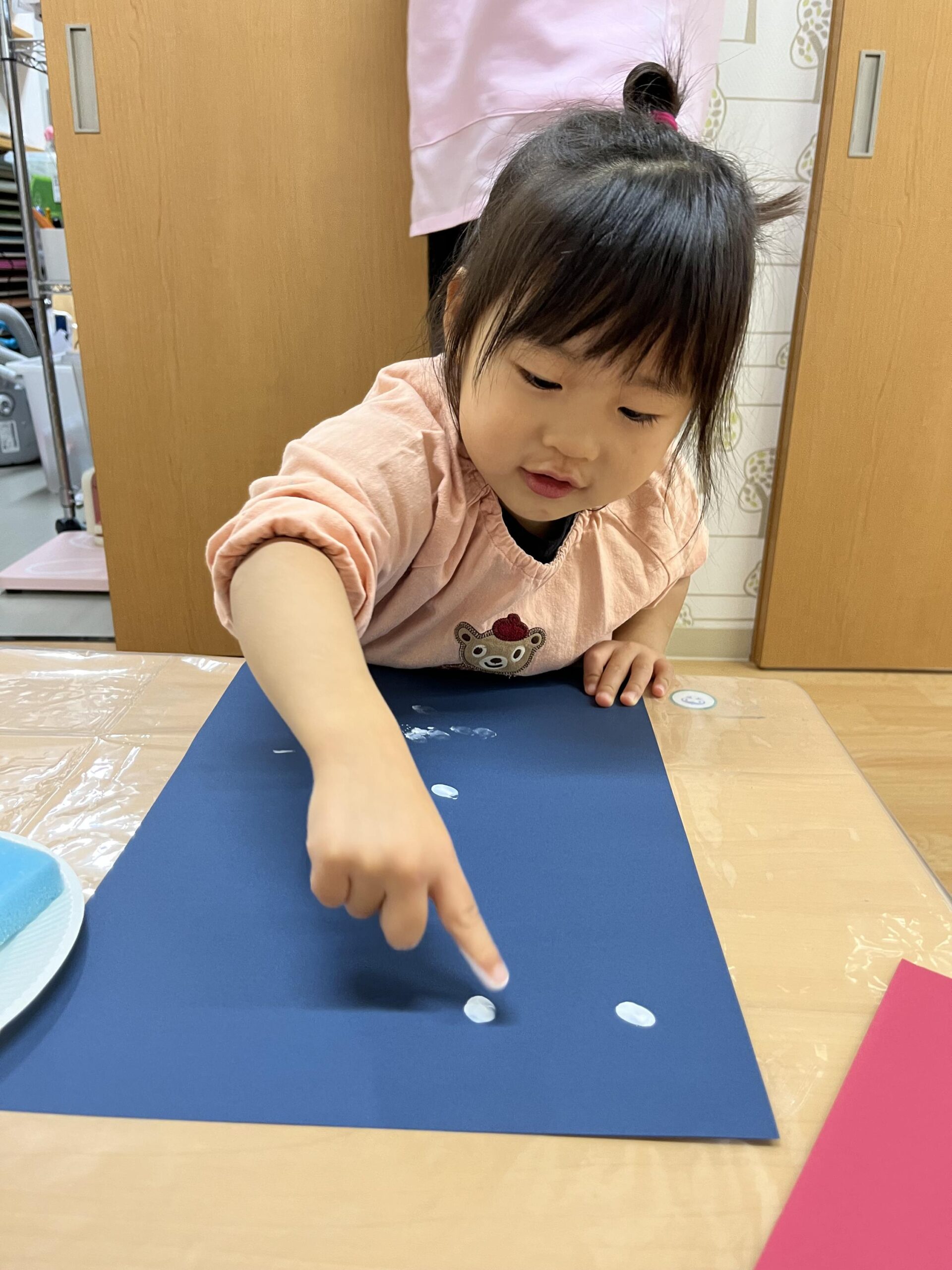 今日は台紙作りから♪手に絵の具をつけて人差し指でポンポンと押していきます♪