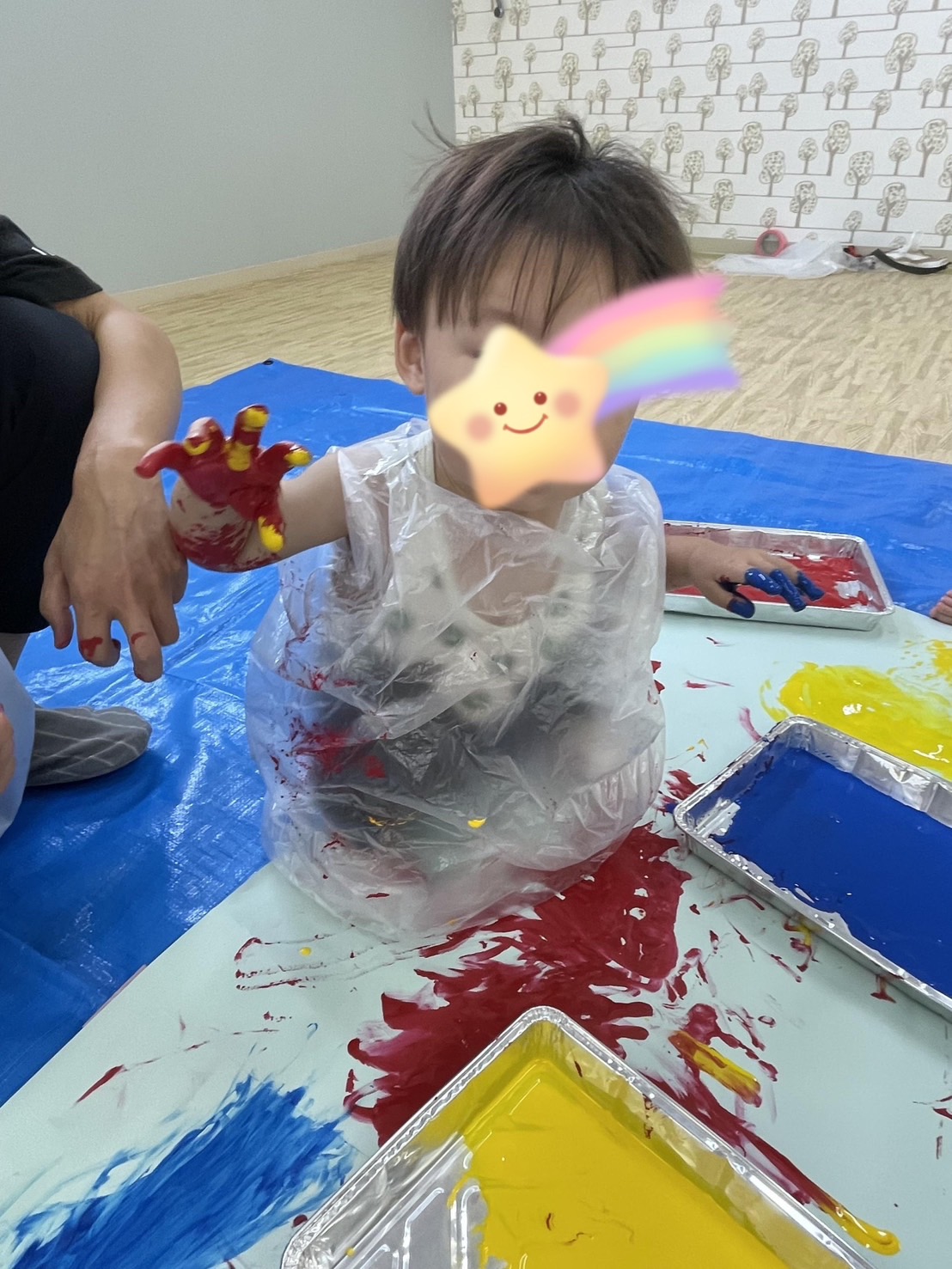 この日は室内で絵の具と大きなB紙を用意して子ども達に思いっきり絵の具で遊んでもらいました!!✨