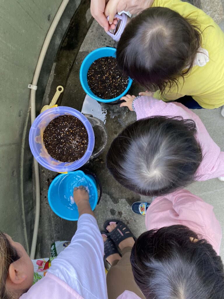 当園では、今年度より「食育推進」の一環として、5月から「バケツ稲」によるお米づくりを始めました!最初は種をまいて、水やりをしますが…なかなか芽が出てきません。でも、子どもたちは「まだかな~♪」とワクワクしながら、毎日お水をあげてお世話をしてくれています。そして数日後、かわいい芽が顔を出すと、子どもたちはとっても嬉しそうに、友だちや先生に知らせてくれました(^^)♪お米が実るのはまだまだ先ですが、これからも大切にお世話をしていきます。子どもたちの成長とともに、お米の成長も楽しみに見守っていきたいと思います。