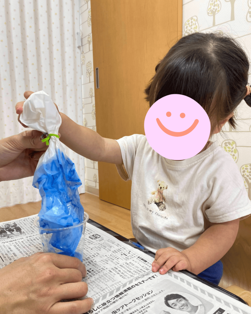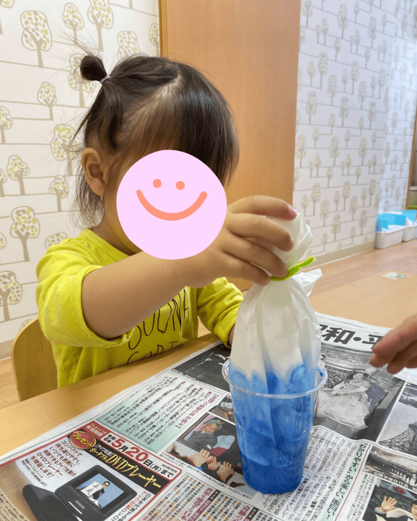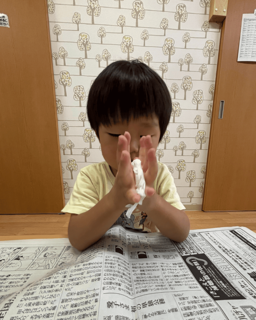 まずはてるてる坊主を作ります!お顔を作るために一生懸命丸くしています。